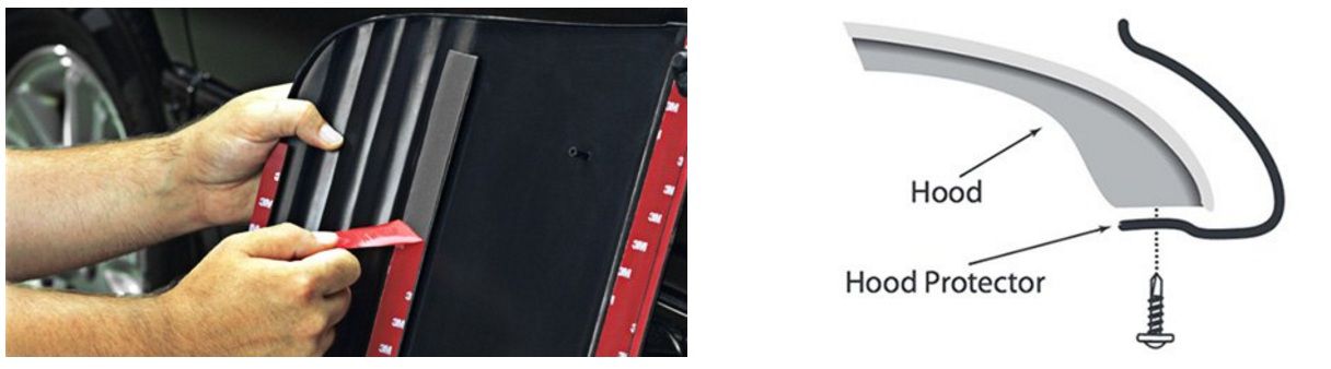 Дефлектор капота монтируются на месте с помощью винтов или двусторонней клейкой ленты. Некоторые производители, например, WeatherTech (США), используют комбинированное крепление (клипсы + клейкая лента). Подробно способ крепления указан в инструкции, которая идет в комплекте к каждому дефлектору, приобретаемому в нашем интернет-магазине, не зависимо от производителя. Большинство производителей дефлекторов капота, например, EGR (Австралия), SIM (Россия), VIP-Tuning (Россия), используют крепление на болтах. Обычно такие отбойники имеют форму рукава, один край которого проходит под капотом, или у них есть скобки, которые проходят под капотом. В любом случае, отверстия в скобах будет позиционироваться для того, чтобы позволить вам использовать собственные уже существующие отверстия в крышке капота, где прикреплена решетка или защитная резинка. Просто снять клипсу крепления накладки, установить дефлектор, и зафиксировать все обратно на место.