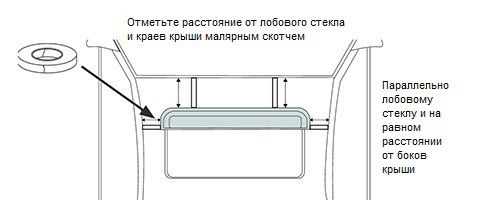 ШАГ 2.Приложите дефлектор, где он будет установлен, убедившись, что он на равном расстоянии от краев крыши и его передний края параллелен лобовому стеклу. Потратьте время и измерьте тщательно все расстояния. После того, как вы определили оптимальное положение, отметьте угловые ребра с малярной клейкой лентой, это пригодится в последующих шагах.