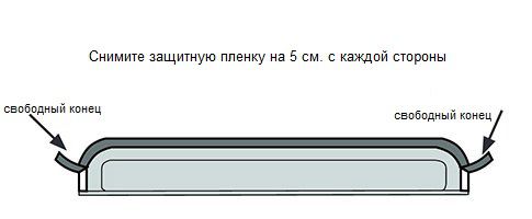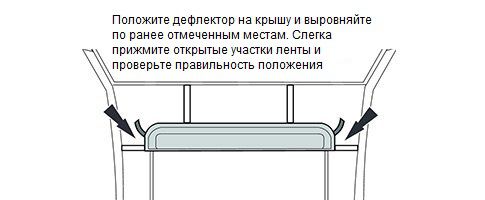 ШАГ 3.Отклейте небольшую часть (около 5см.) защитной полосы скотча на обоих концах дефлектора. Убедитесь, что свободные концы на внешней стороне козырька, когда вы приложили его к крыше.
