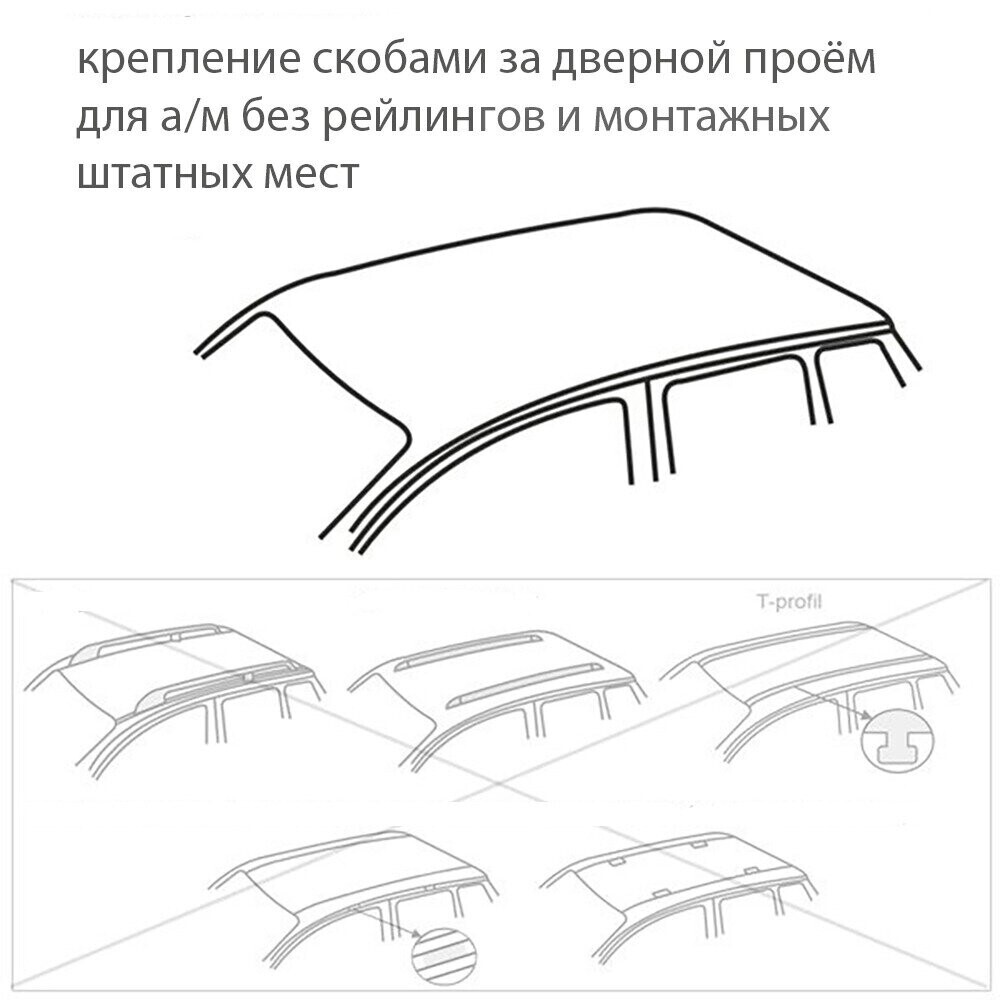 В комплект входит две поперечины и четыре опоры, для установки на автомобили без рейлингов и штатных монтажных мест. Металлические скобы, в основании опор, маркируются под каждую группу автомобилей D1-D7 имеют разную длину и изгиб, для лучшей совместимости и позволяют закрепить их за дверной проем. Резиновые прокладки закрепленные на скобах не дадут оставить царапины при эксплуатации багажника.Собранная конструкция крепко держится и позволяет перевозить грузы весом не больше 75 кг.