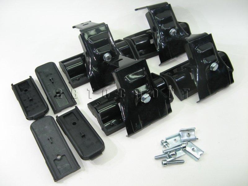 В комплект входит две поперечины и четыре опоры, для установки на автомобили без рейлингов и штатных монтажных мест. Металлические скобы, в основании опор, маркируются под каждую группу автомобилей D1-D7 имеют разную длину и изгиб, для лучшей совместимости и позволяют закрепить их за дверной проем. Резиновые прокладки закрепленные на скобах не дадут оставить царапины при эксплуатации багажника.Собранная конструкция крепко держится и позволяет перевозить грузы весом не больше 75 кг.