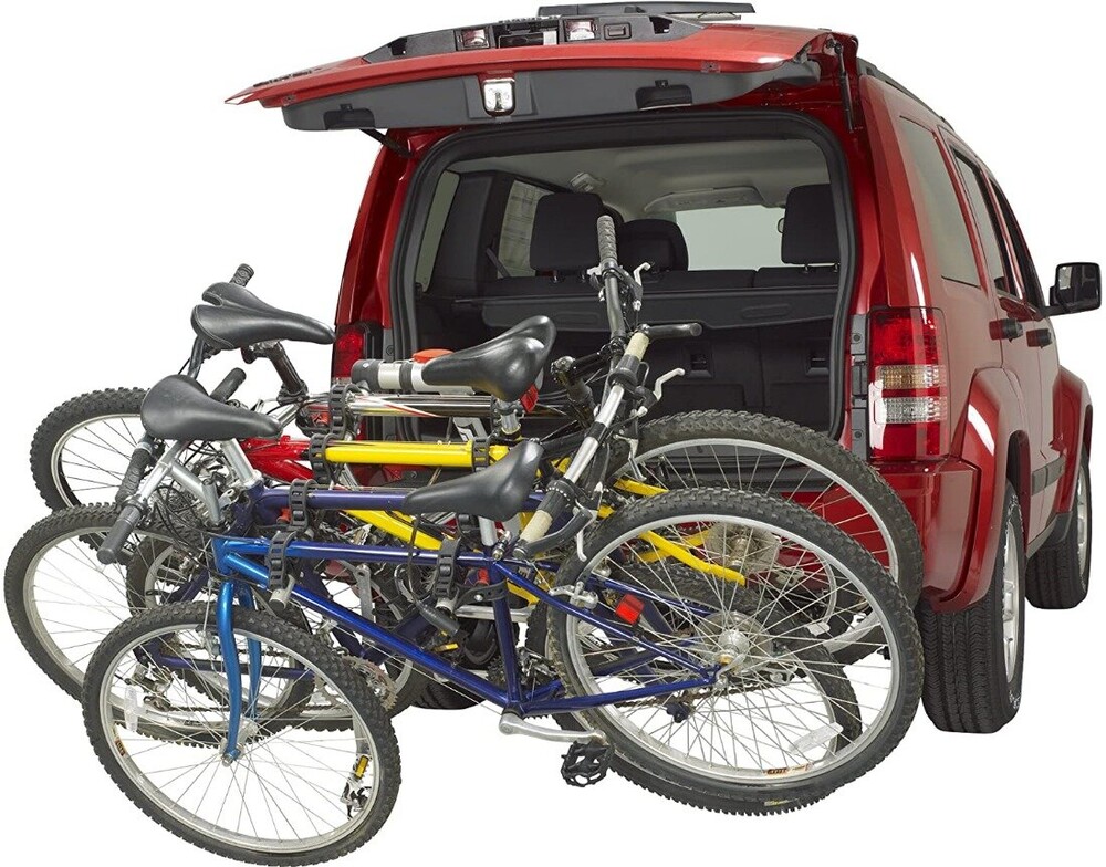 Противоскользящие ролики уменьшают движение велосипеда во время движения Откидывается вниз (даже с загруженными велосипедами) для доступа к задней части автомобиля; рычаги складываются, когда не используются