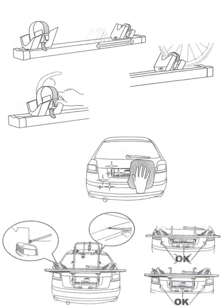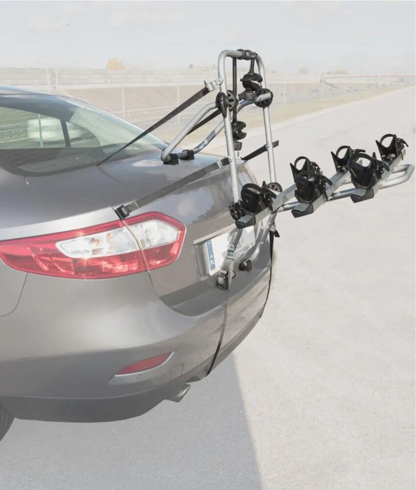 Крепление подходит для автомобилей, не имеющих заднего спойлера, независимо от типа кузова. Фиксация осуществляется при помощи 6 прочных ремней, которые надежно удерживают конструкцию и равномерно распределяют нагрузку. Велосипеды крепятся за раму, что обеспечивает стабильное положение во время движения.