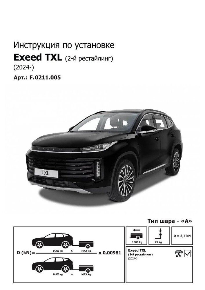Фаркоп Berg для Exeed TXL I поколение 2-й рестайлинг 2024-н.в.,рынок РФ, шар A, 1500/75 кг., F.0211.005.