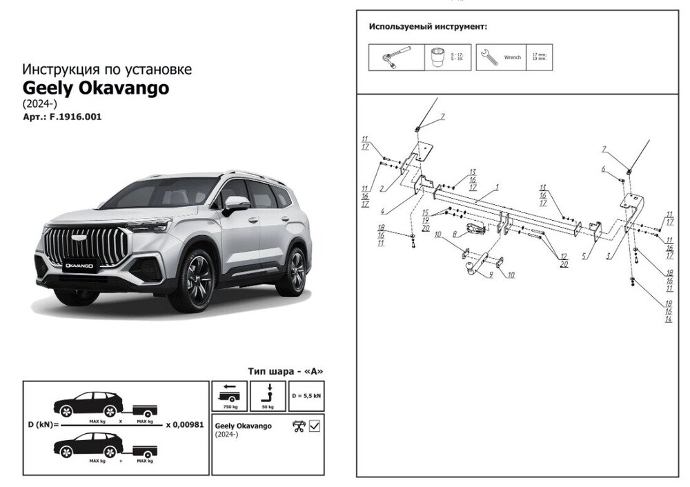 Фаркоп Berg для Geely Okavango VX11 I поколение рестайлинг 2024-н.в., рынок РФ, шар A, 750/50 кг., F.1916.001.