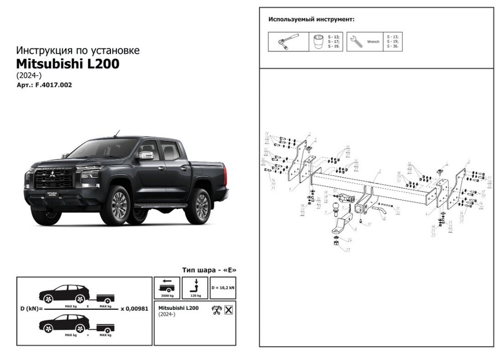 Фаркоп Berg для Mitsubishi L200 VI поколение 2024-н.в., шар E, 3500/120 кг., F.4017.002.