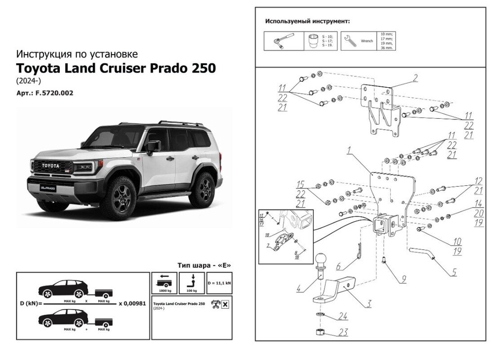 Фаркоп Berg для Toyota Land Cruiser Prado J250 V поколение 2024-н.в., шар E, 1800/100 кг., F.5720.002.