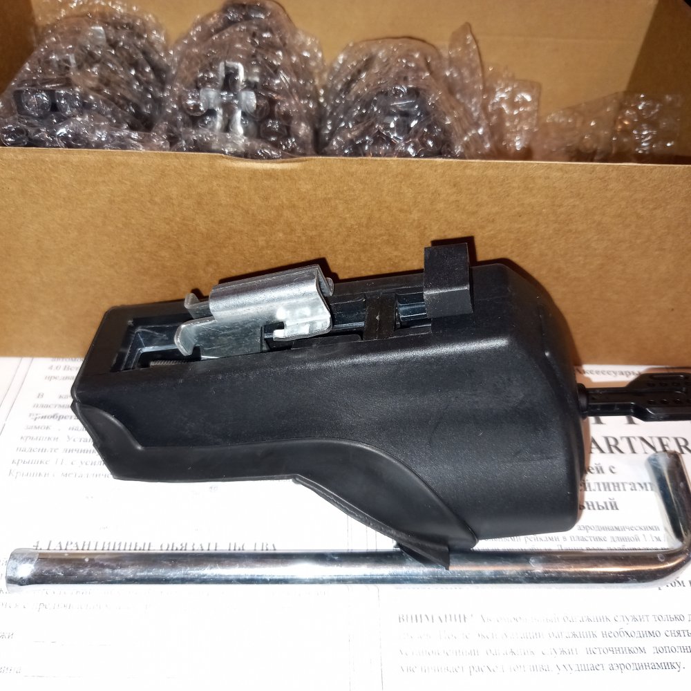 Способ установки : опоры вставляются в паз поперечины, одевается на рейлинги, и зажимается торцевым ключом.