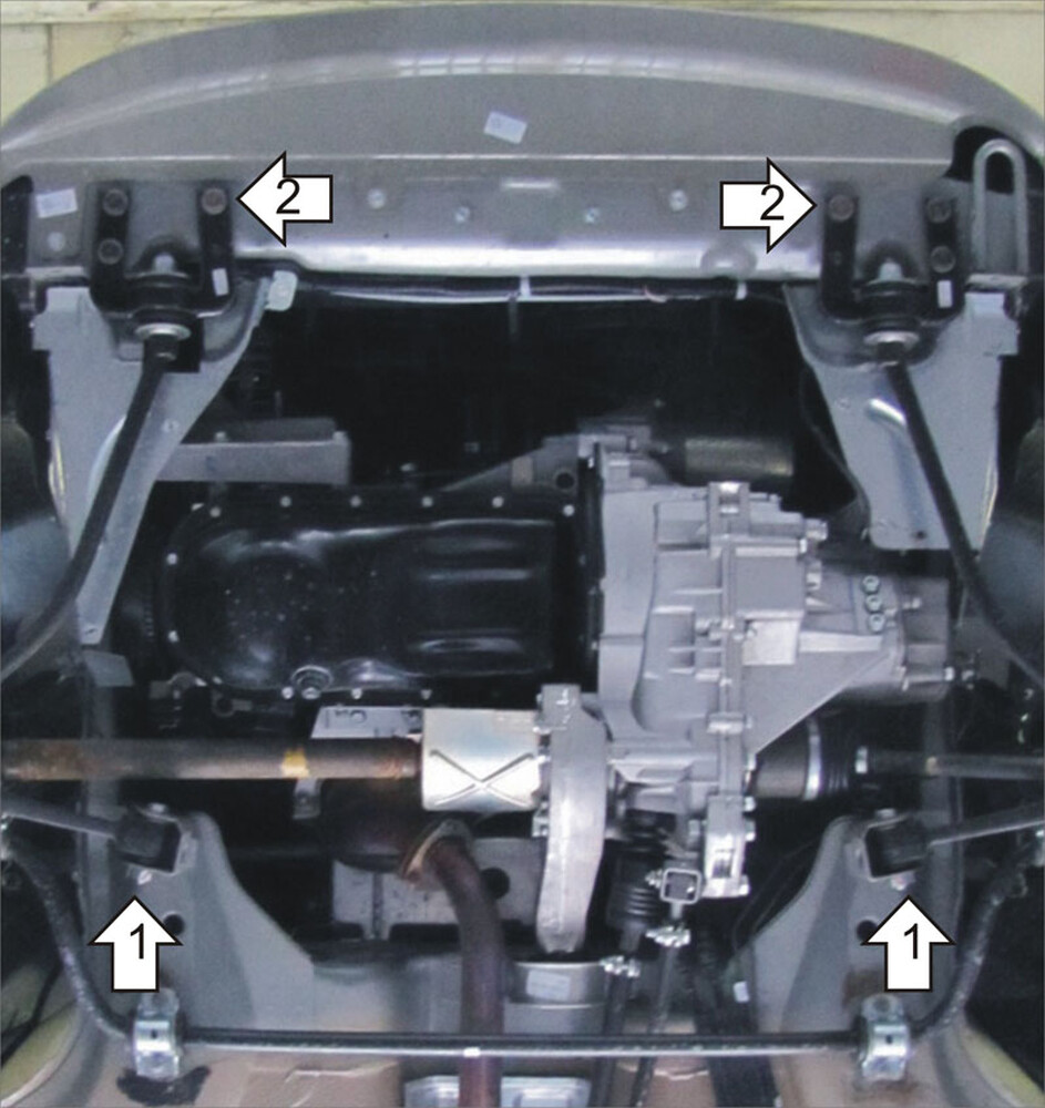 1. Снять штатный пыльник, если он установлен на автомобиле. Установить на болты шарнира нижнего рычага задние точки защиты при помощи штатной гайки М12.\n