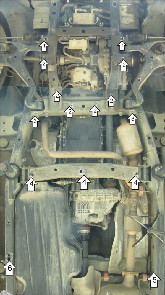 2.Закрепить к подрамнику моторного отсека средние и задние точки защиты Болтами М10х20 с Шайбами и Гр. Шайбами 10.\n