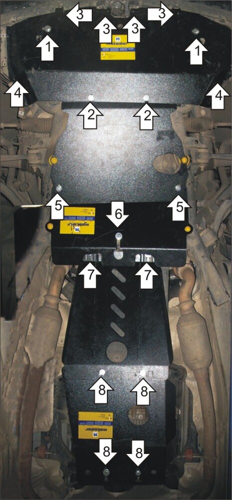 5. Прикрепить Защиту на приварные чашки подрамника двигателя с помощью КЛ51х20 М8 и Болтов М8х30 с Шайбами 8 и Гроверами 8.\n