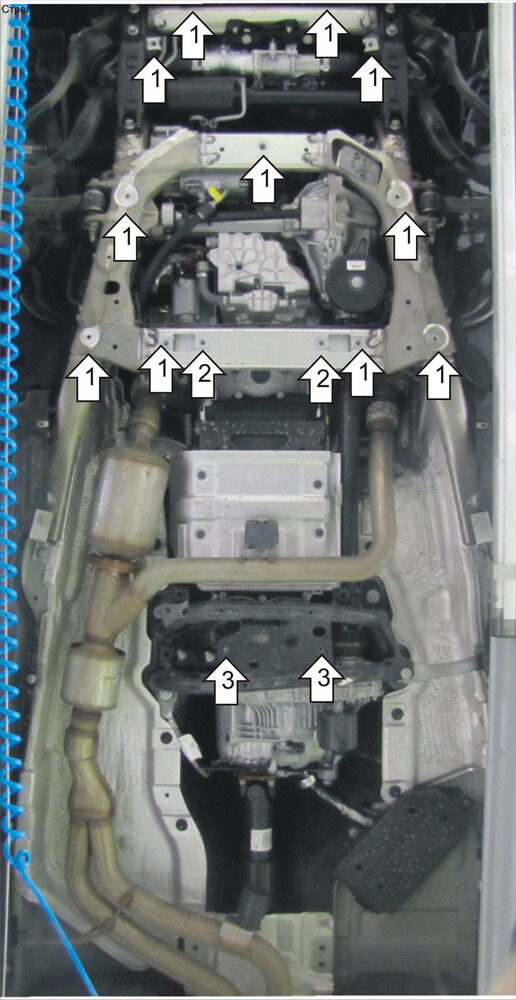 1. Снять штатную защиту. Установить передний щит, используя крепеж штатной защиты.\n