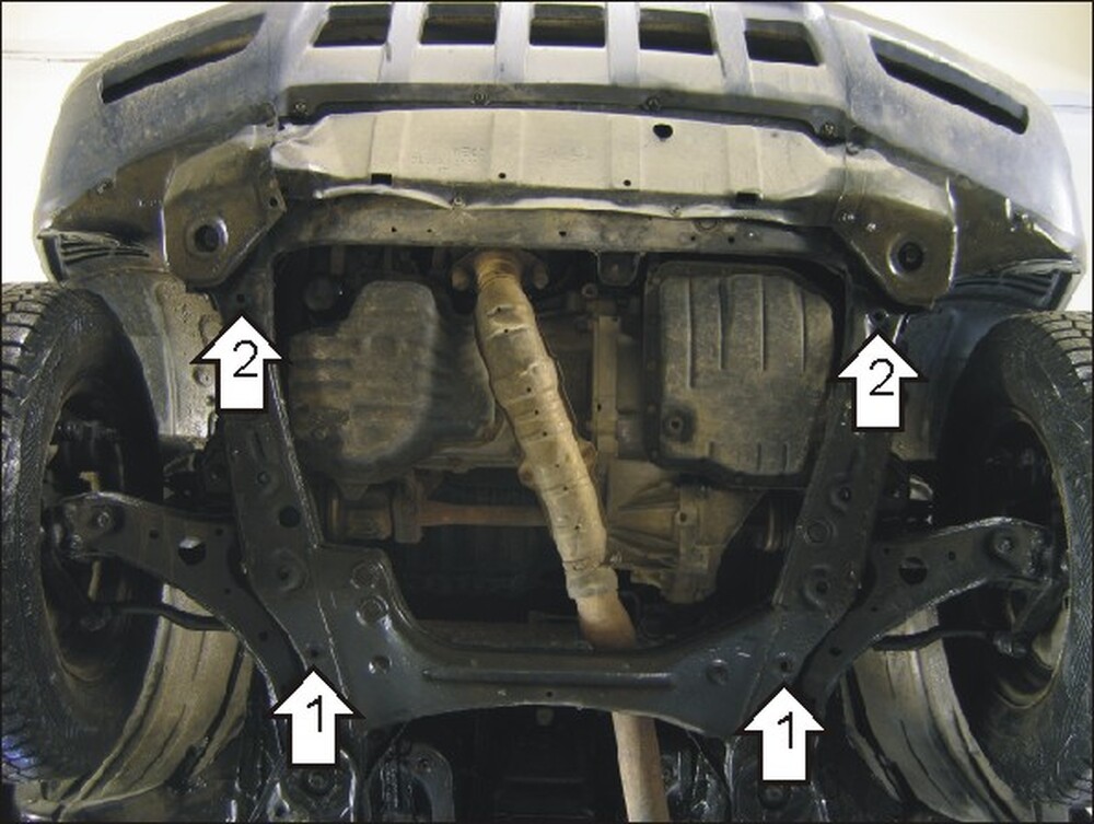 2.Установить в сквозные отверстия подрамника передней части моторного отсека ПЗ 61х20х6 А40 М10, закрепить передние точки защиты, используя Болты М10х110, Проставки 15 с Шайбами и Гроверными Шайбами 10.\n