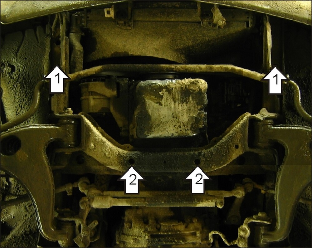 2.Закрепить к подрамнику передней подвески задние точки защиты, используя ПУ 60х14х6 А20В10 М8, Болты М8х30 с Шайбами и Гр. Шайбами 8.\n