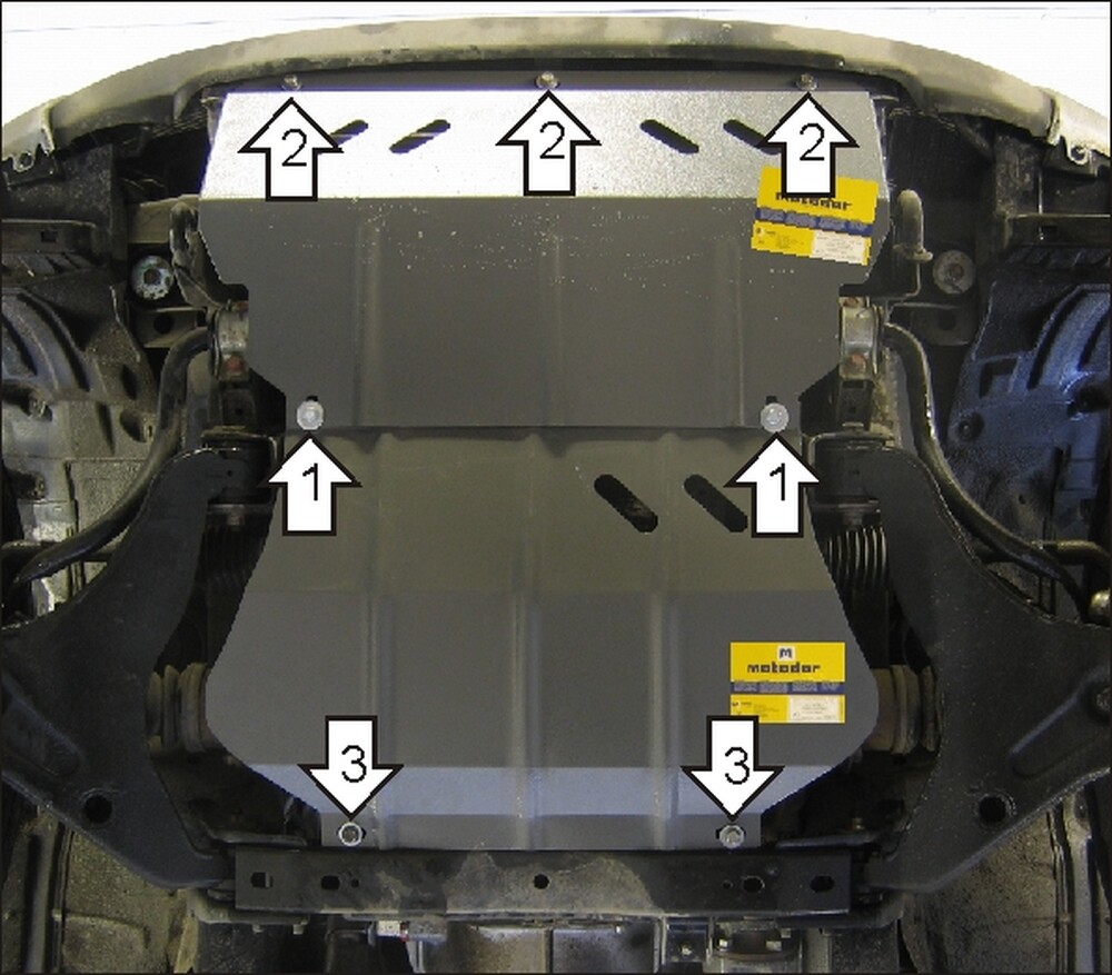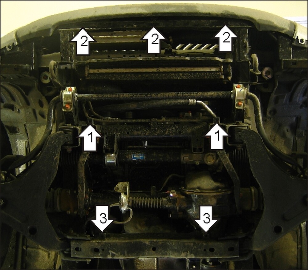 2. Защита MOTODOR крепится на указанные штатные точки крепления поперечных балок рамы атомобиля.\n