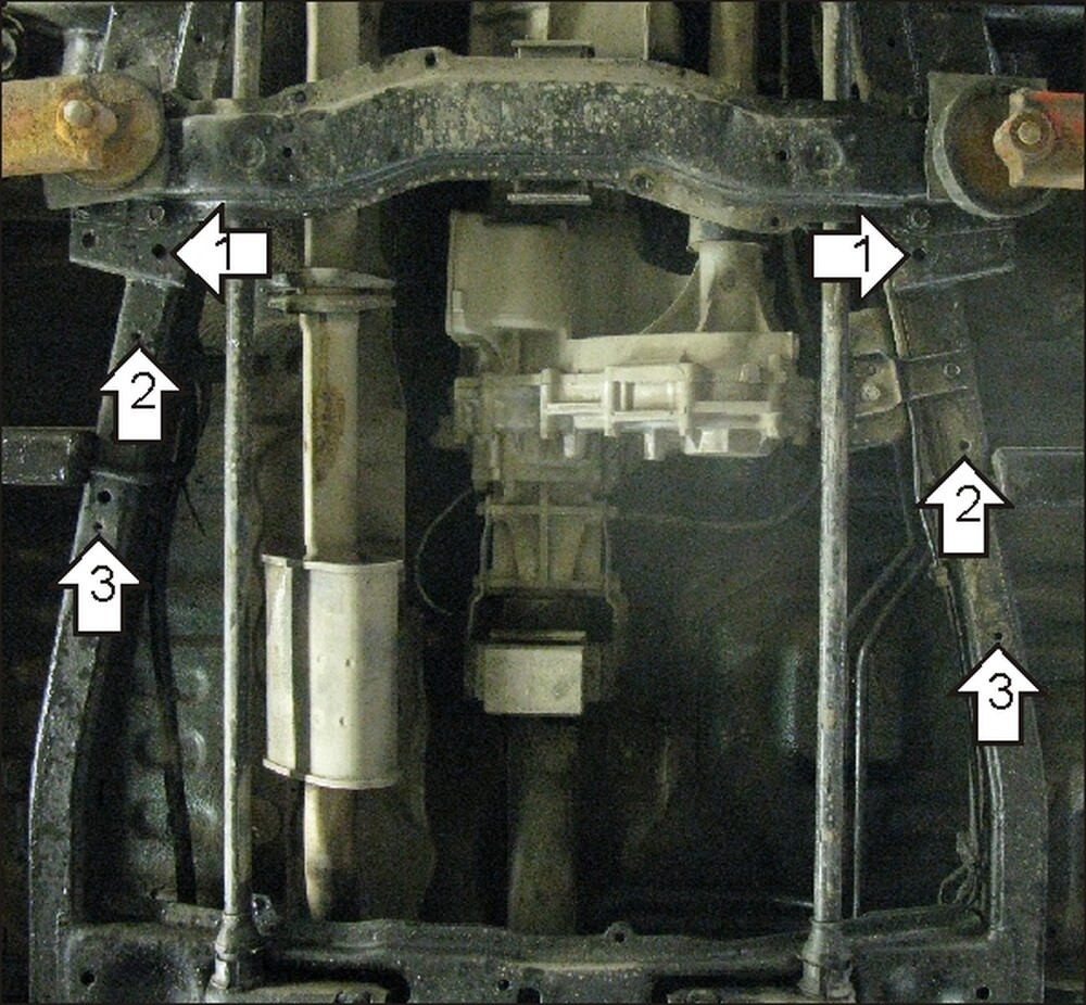 2.Закрепить в штатные резьбовые отверстия рамы средние точки защиты, используя Болты М8х30 с Шайбами 10, Шайбами и Гр. Шайбами 8.\n