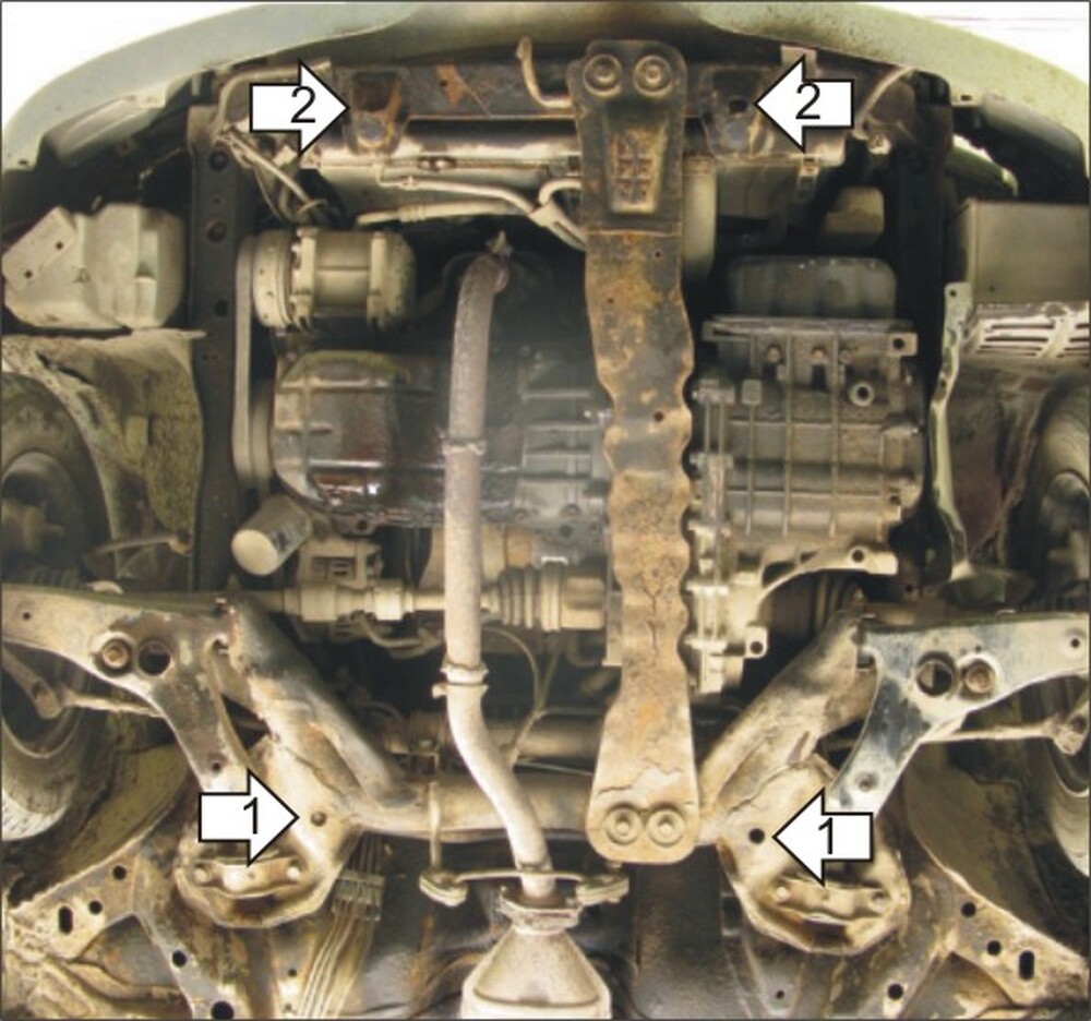 1. Установить на подрамник моторного отсека задние точки крепления Защиты при помощи ПР 50х20х6 М10, Болтов М10х30, Шайб 10 и Гроверов 10.\n