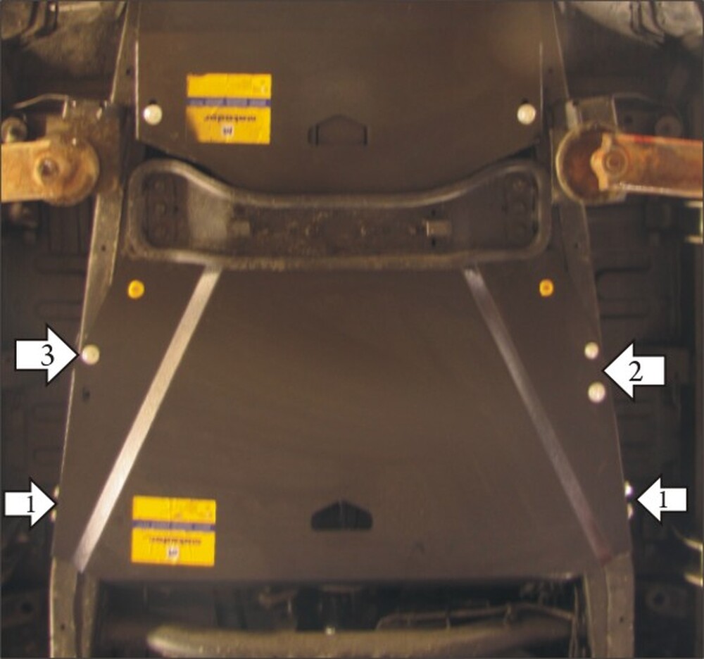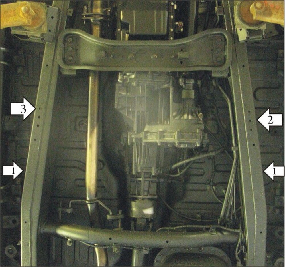 1. Установить в штатные резьбовые отверстия лонжеронов задние точки защиты с помощью 4-х Болтов М10х30х1,25.\n