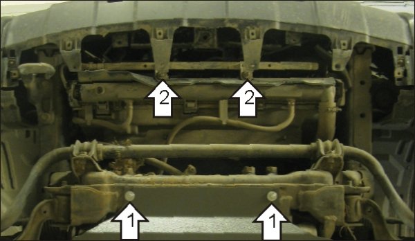 1. Закрепить к подрамнику моторного отсека задние точки защиты на крепеж второго щита.\n