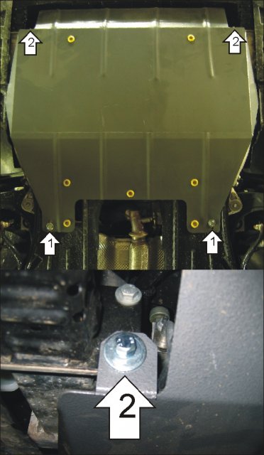 1.Завести в отверстия подрамника передней подвески ПР 80х20х6 М10 и наживить Болты М10х50 с Шайбами и Гр. Шайбами 10. Завести задние точки крепления защиты.