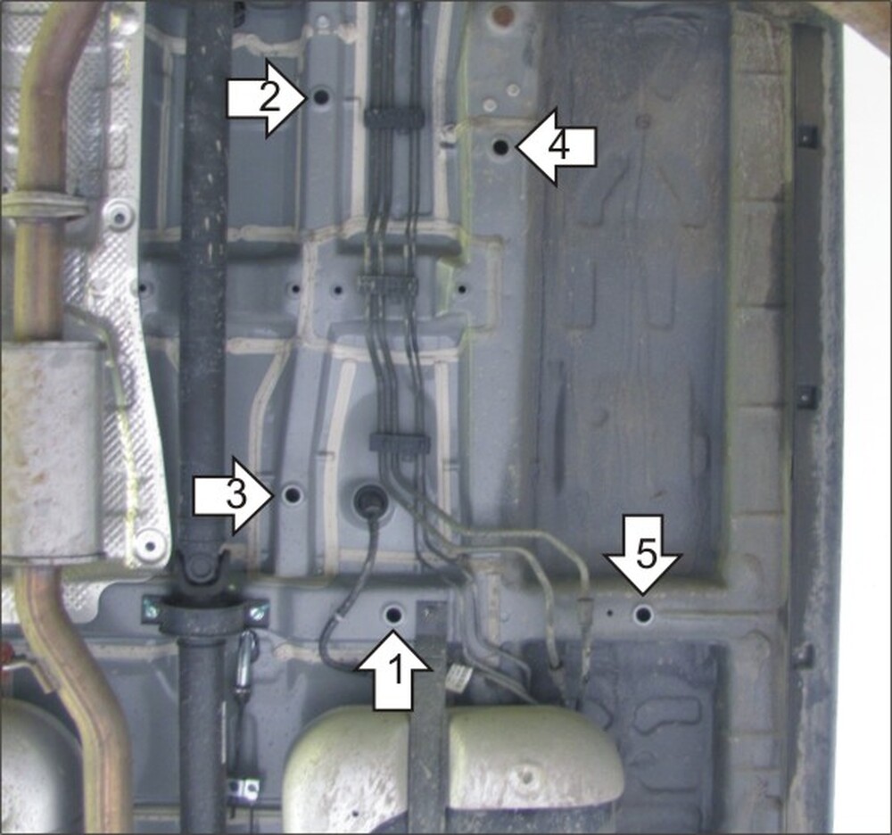 2, 3, 4, 5. Установить на отверстия а/м защиту при помощи ПУ 60х14х6 А20В10 М8 и Болтов М8х20.