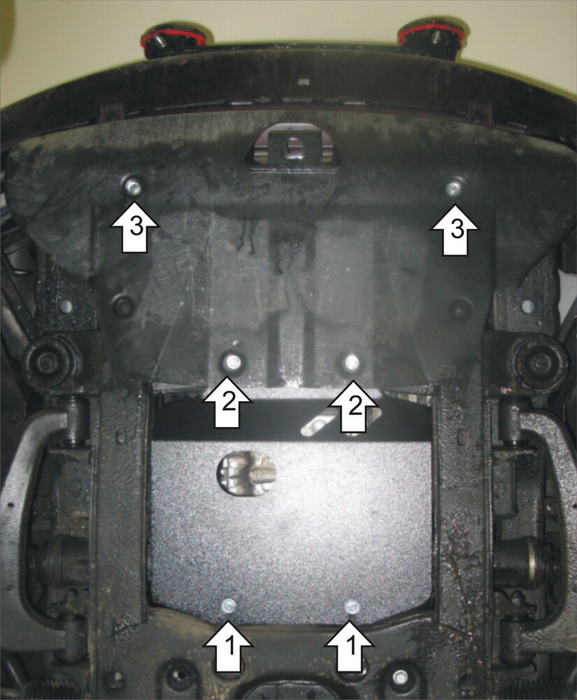 3. Закрепить защиту в передних точках крепления в штатные резьбовые отверстия при помощи Болтов М8х30 с Шайбами 8 и Гроверами 8.