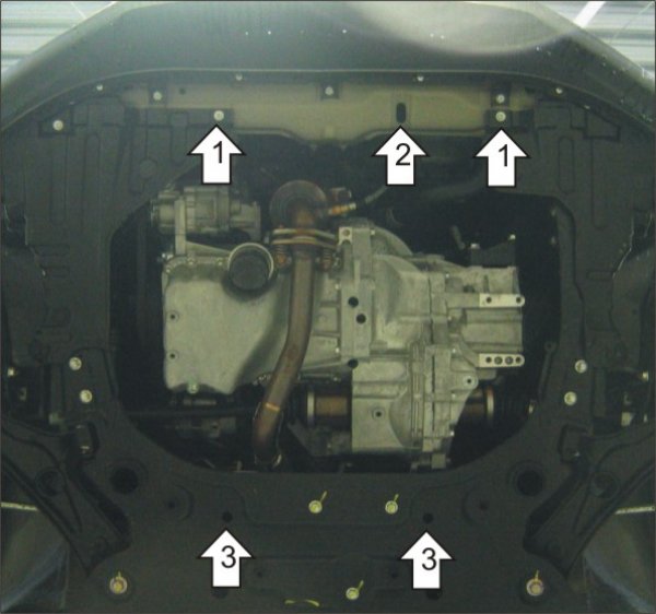 1. Закрепить передние боковые точки крепления Защиты на штатные резьбовые места крепления пыльника при помощи штатных болтов.