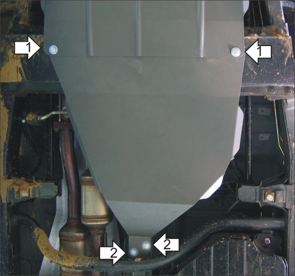 1. Установить передние точки крепления певого щита под штатные болты крепления оригинальной защиты.
