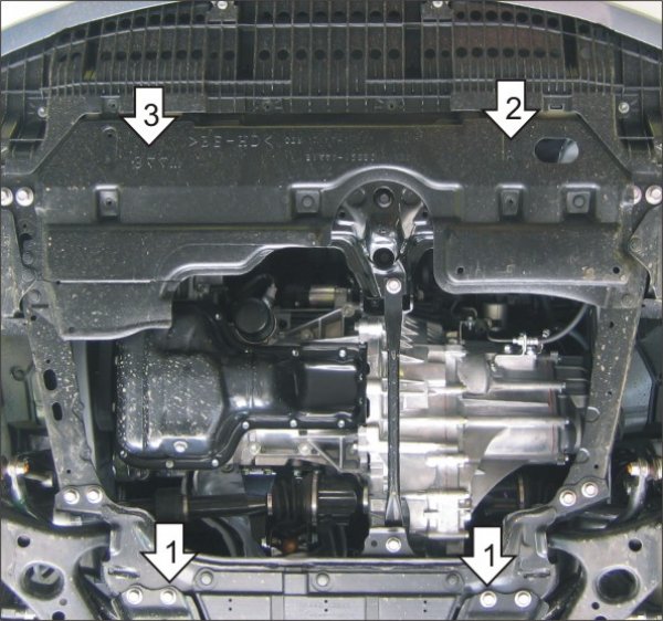 1. Снять штатный пыльник. Установить на подрамник задние точки крепления Защиты при помощи штатного крепления.
