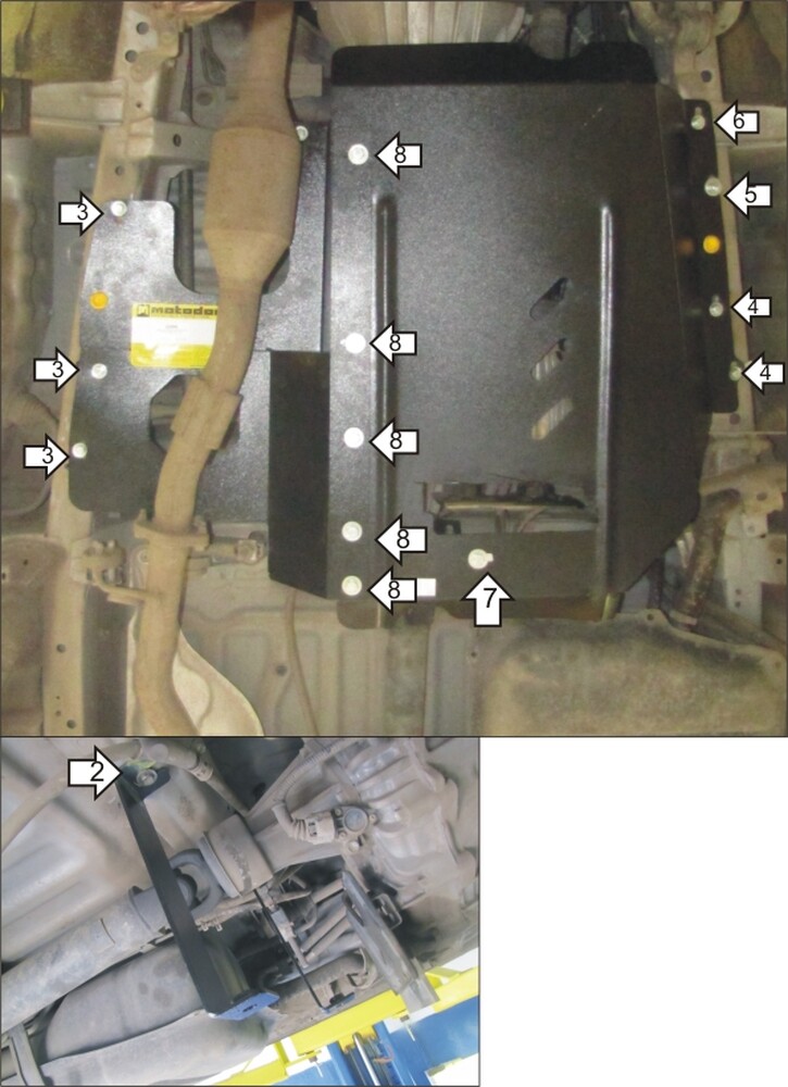 2. Установить кронштейн 2 используя штатный крепеж или Болты М8х20, Шайбы и Гр. Шайбы 8.