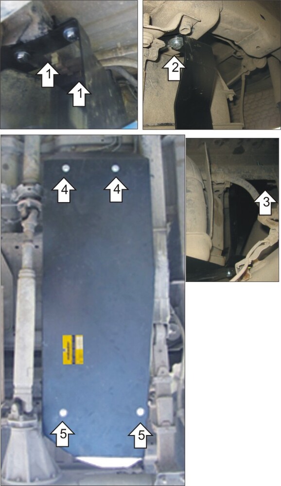 2. Установить напротив опор шарниров передней подвески задние точки крепления Защиты при помощи ПГ 30х14х5 А15 М8, Проставок 15, Болтов М8х50, Шайб 8 и Гроверов 8.