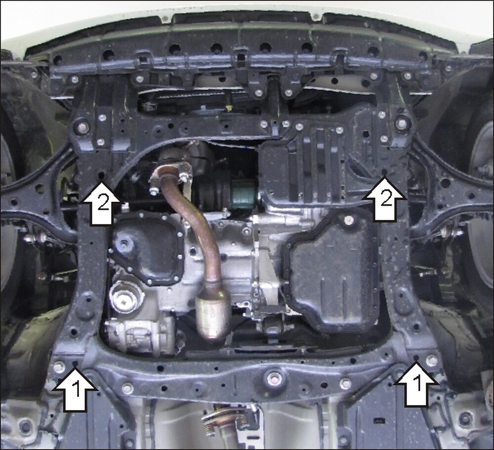 2.Закрепить к подрамнику передней подвески передние точки защиты при помощи ПУ 60х14 А20В10 М8, Болтов М8х30 с Шайбами и Гр. Шайбами 8.