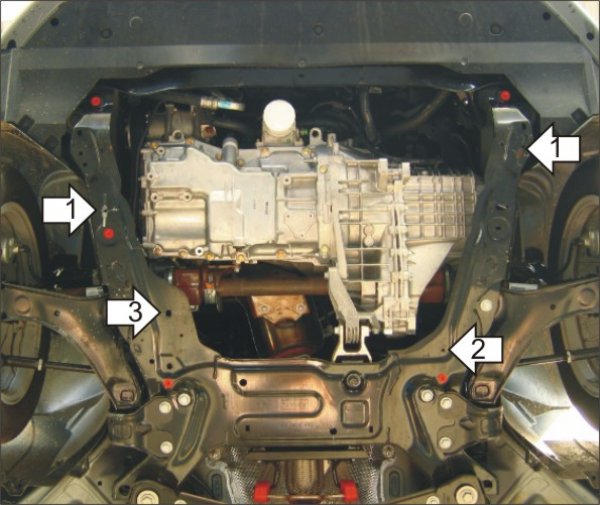 1. Снять пластиковый пыльник. Установить в отверстиях подрамника переднюю часть Защиты при помощи ПУ 60х14 А20В10 М8, Болтов М8х30, Шайб 8 и Гроверов 8.