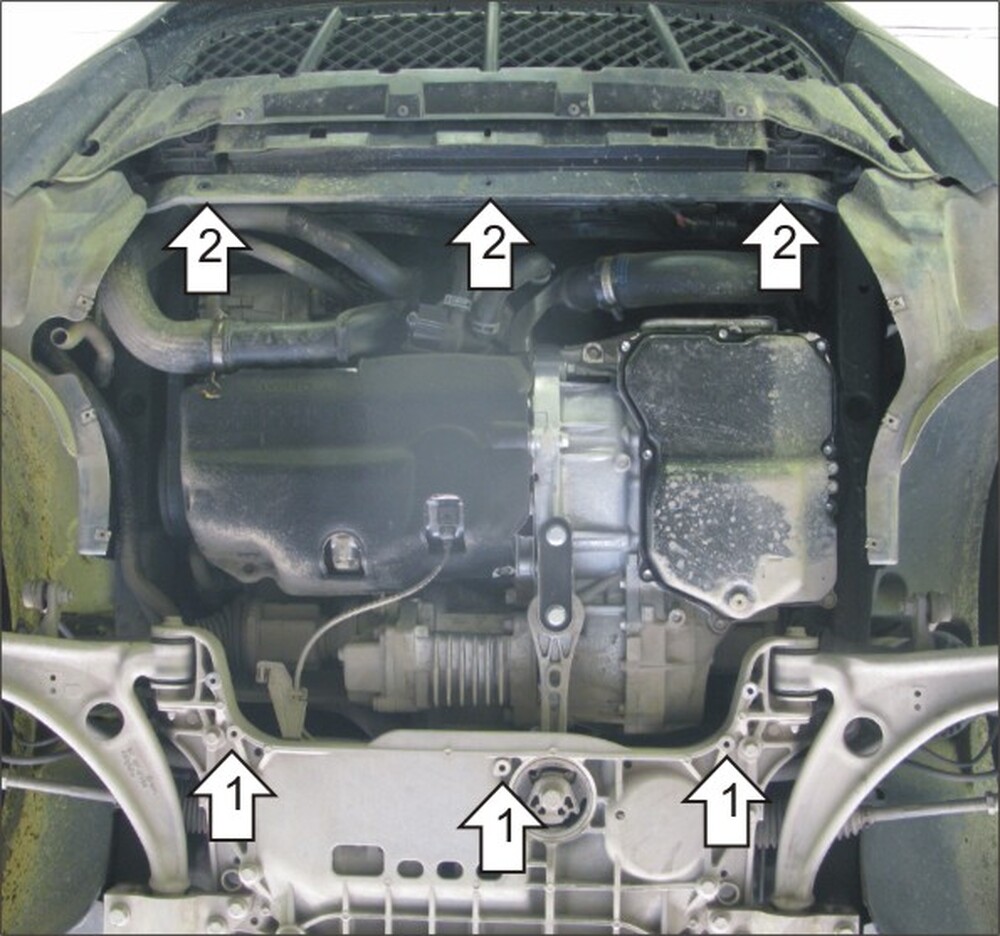 1. Снять пластиковый пыльник. Установить на поперечную балку передней подвески задние точки крепления Защиты при помощи Болтов М8х20, Шайб 8 и Гроверов 8.