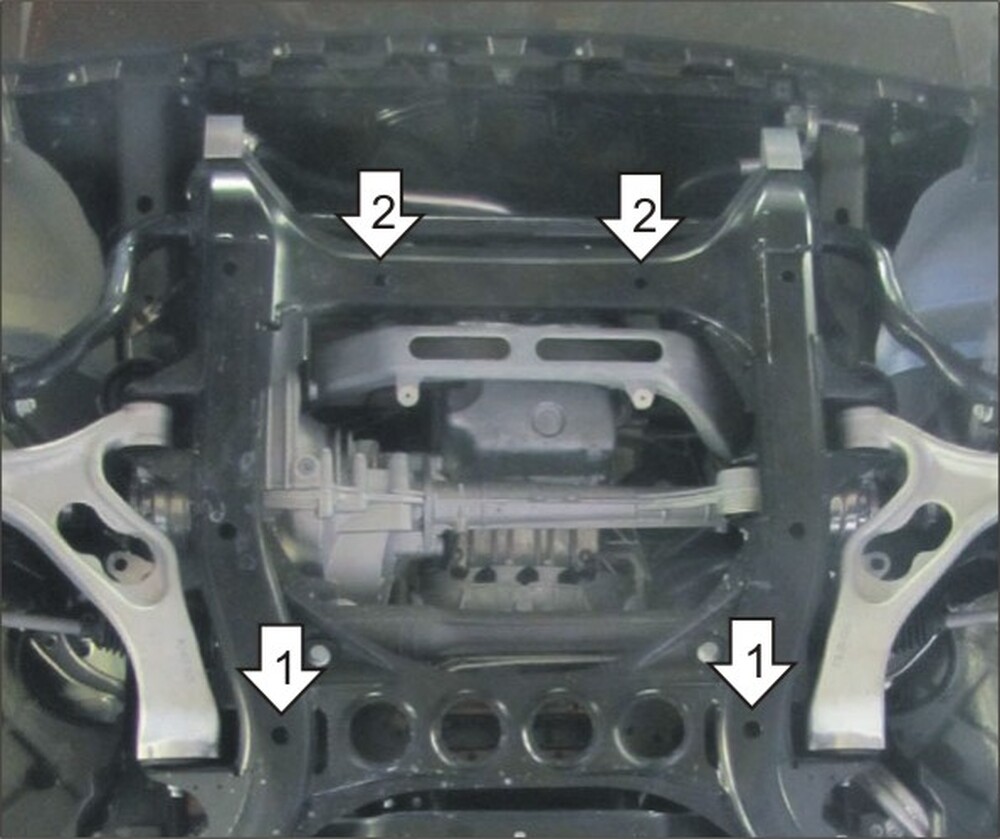 1. Установить на подрамник в задней части моторного отсека задние точки крепления Защиты при помощи ПУ 60х14х6 А20В10 М8, Болтов М8х30, Шайб 8 и Гроверов 8.