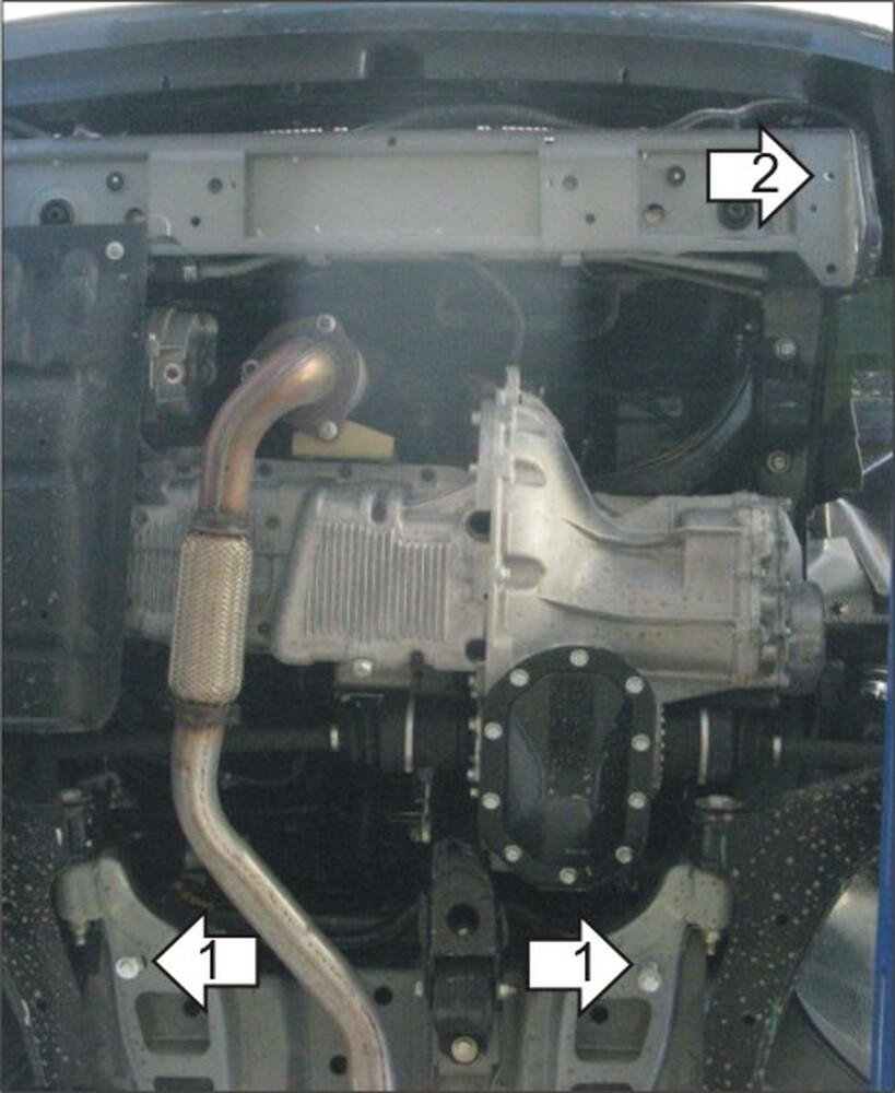 1. Снять пластиковый пыльник. Установить на подрамник в задней части моторного отсека задние точки крепления Защиты при помощи ПР 70х20х6 А15 М10, Болтов М10х30, Шайб 10 и Гроверов 10.