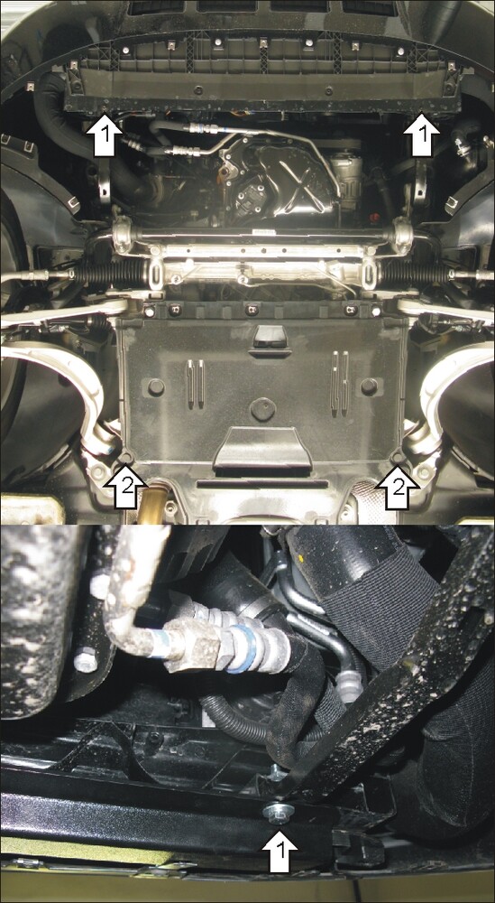 1.Сняв переднюю часть пластикового пыльника, вывернуть штатные винты из продольной прямоугольной балки и вынуть штатные клипсы. На их место установить слева КЛ 51х20 А40 М8, а справа ПР 30х14х5 А10 М8. Установить Кронштейн, используя Болты М8х40 с Шайбами и Гр. Шайбами 8. Надеть Клипсы КЛ 51х20 А40 М8, совместив их с пазами Кронштейна. Установить на место переднюю часть пыльника, отцентрировав его отверстия с отверстиями в клипсах.