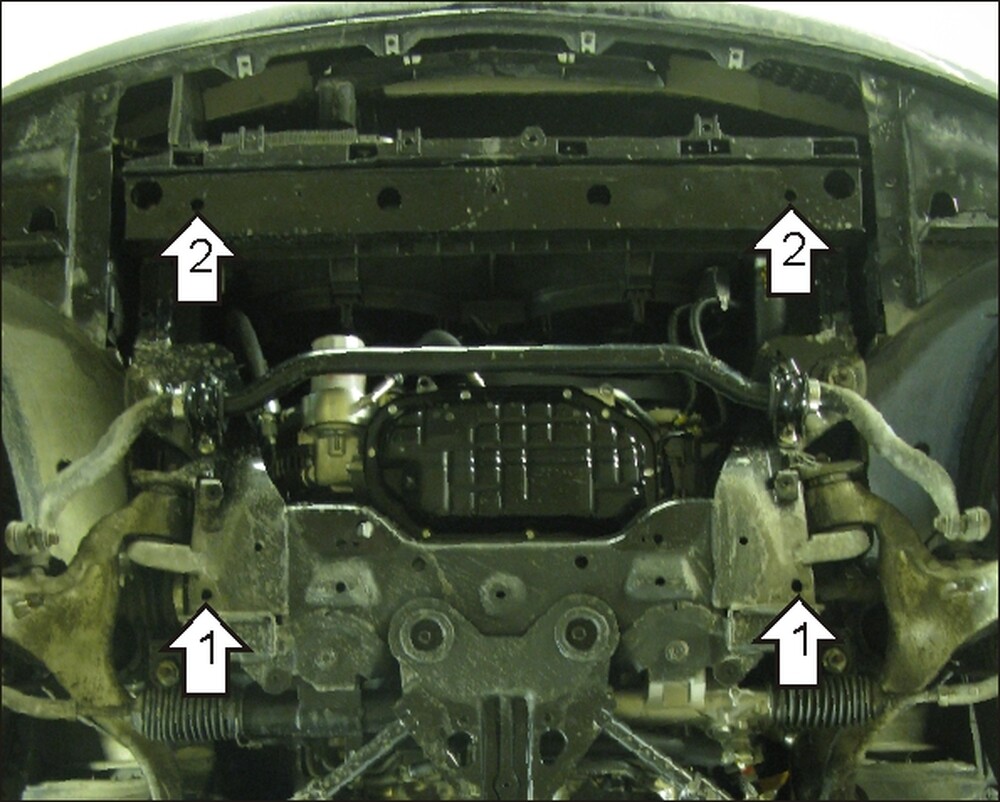 1.Соосно с отверстиями в подрамнике передней подвески разместить ПЗ 56х20х6 А30 М10 и наживить Проставки 15, Болты М10х120 с Шайбами и Гр. Шайбами 10. Завести задние точки защиты.