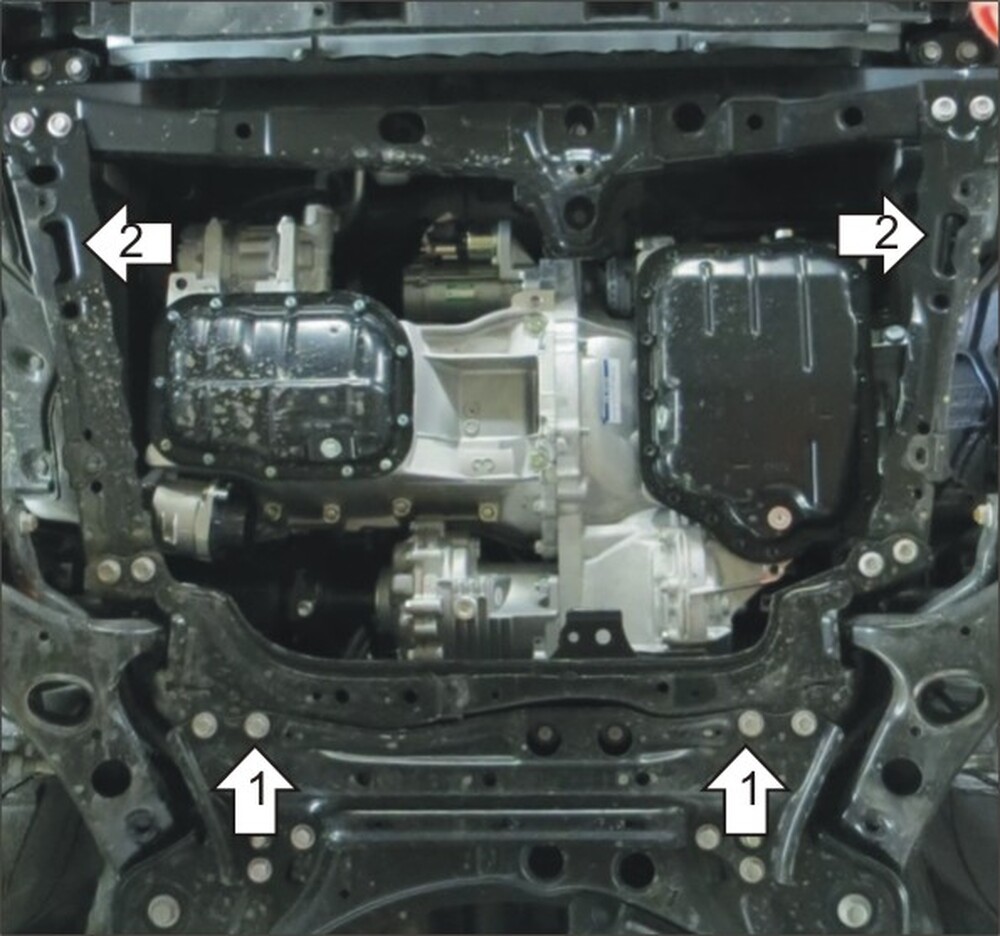 1. Установить на штатные болты крепления подрамника задние точки защиты.\n