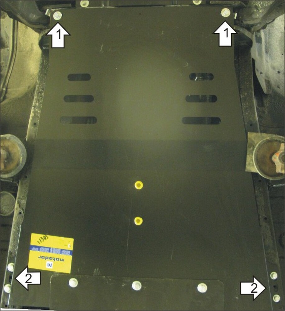1.передние точки защиты к подрамнику передней подвески при помощи ПЗ 61х20х6 А40 М10, Болтов М10х30 с Шайбами 10 и Гр. Шайбами 10.