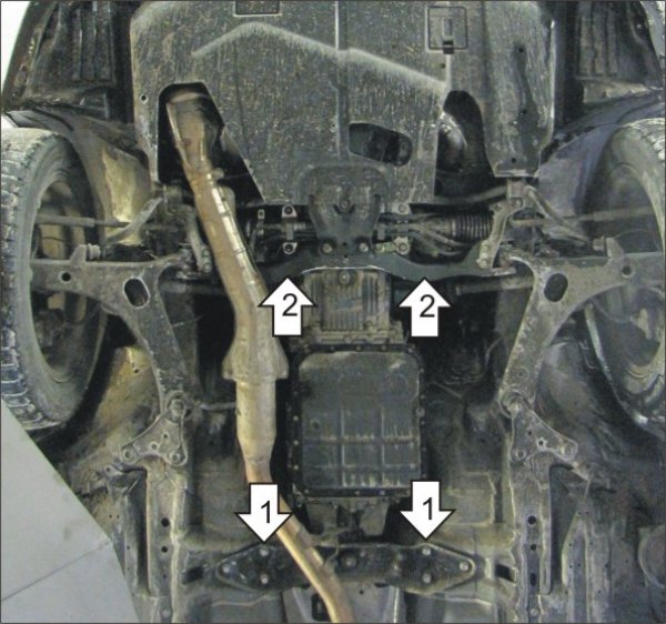 2. Установить на поперечную балку передней подвески передние точки крепления Защиты при помощи ПР 80х20х6 М10, Болтов М10х30, Шайб 10 и Гроверов 10.