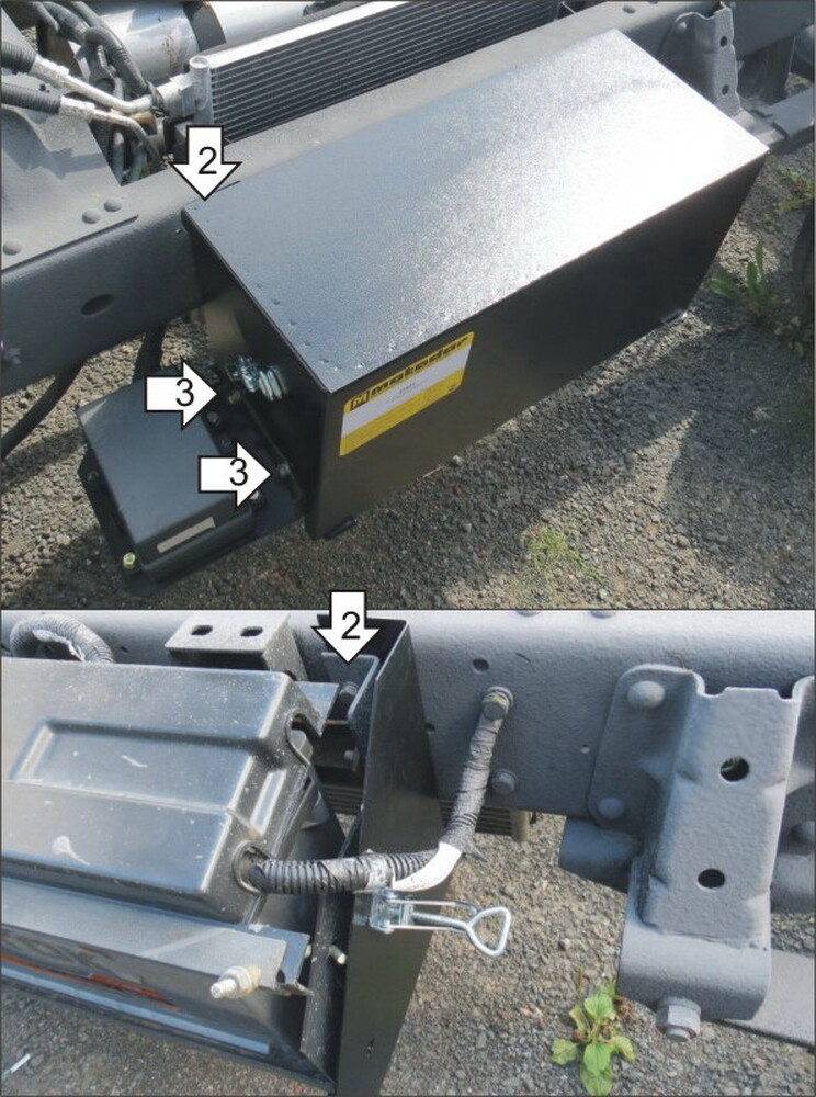 2. Установить защиту под штатную площадку крепления аккумулятора штатными болтами.