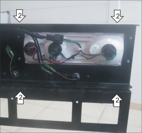 2. Установить короб в сборе на швеллер в местах крепления фонарей, так чтобы полка швеллра находилась между стенкой короба и пластинами