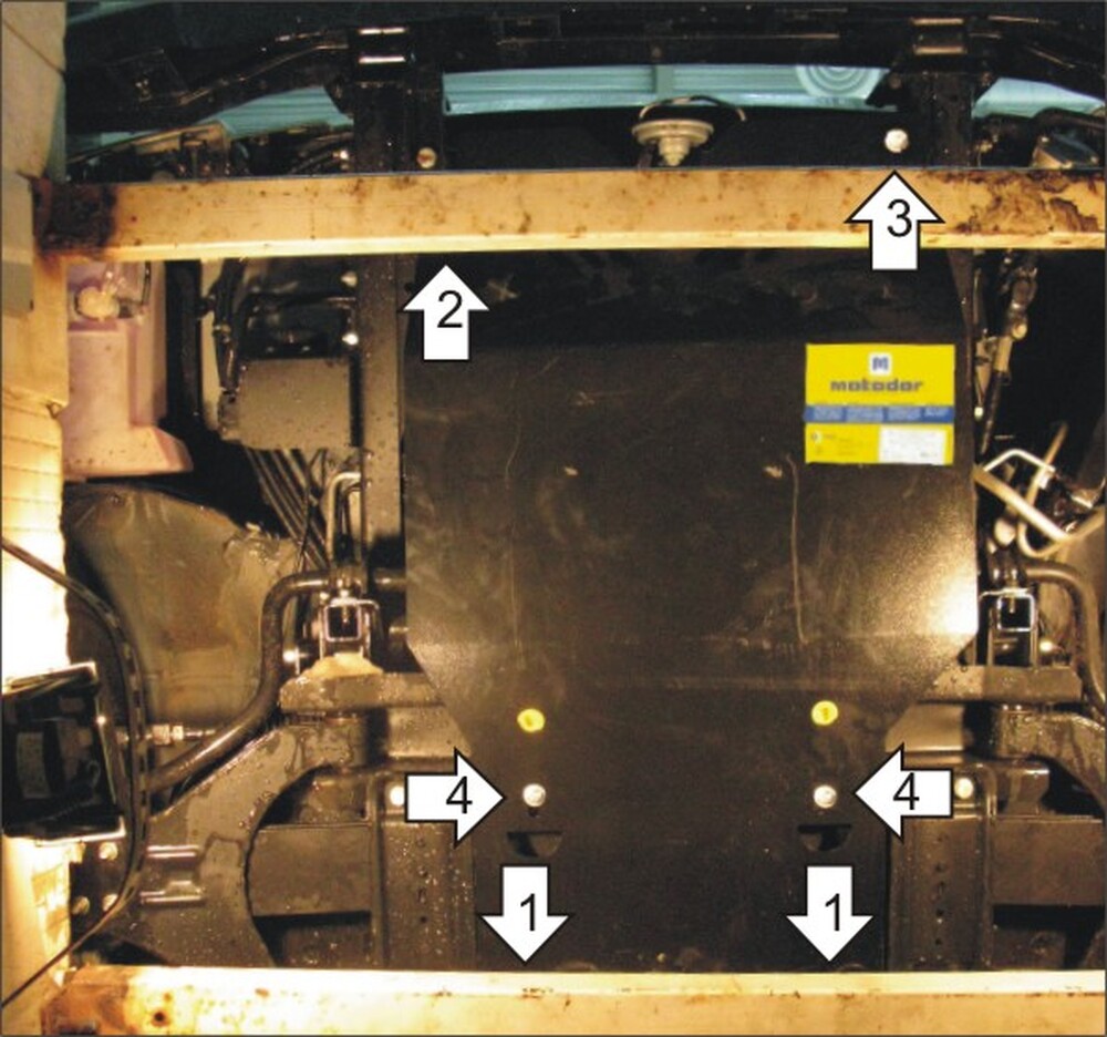 1. Установить на поперечную балку передней подвески задние точки крепления Защиты при помощи ПР 50х20 М8, Болтов М8х30, Шайб 8 и Гроверов 8.