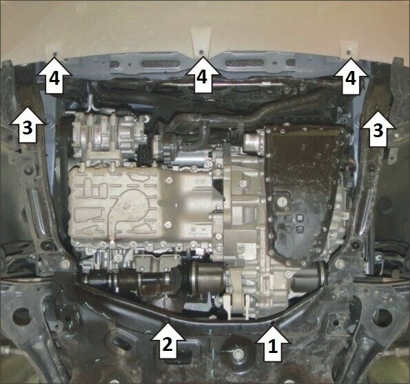 Снять штатный пластиковый пыльник.1. Установить заднюю левую точку крепления защиты в штатное отверстие в подрамнике при помощи планки ПР30х14х6 М8, болта М8х30, шайбы и гр. шайбы 8.2. Установить заднюю правую точку крепления защиты в штатное отверстие в подрамнике при помощи планки ПР50х20х6 М8, болта М8х30, шайбы и гр. шайбы 8.3. В штатные резьбовые отверстия в подрамнике установить средние точки крепления защиты при помощи болтов М8х30, шайб 8 и гр. шайб 8. 4. В штатные резьбовые отверстия в поперечине кузова установить передние точки крепления защиты при помощи болтов М6х20, шайб 6 и гр. шайб 6. Затянуть весь крепеж.