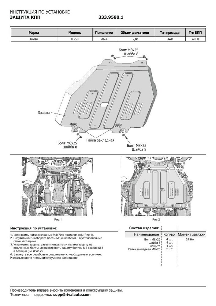 Защита картера, КПП, РК, топливного бака Rival для Toyota Land Cruiser Prado J250 V поколение АКПП 4WD 2024-н.в., алюминий 3 мм, с крепежом, штампованная
