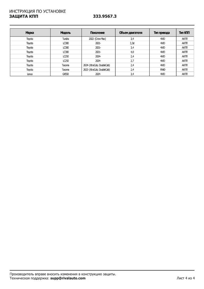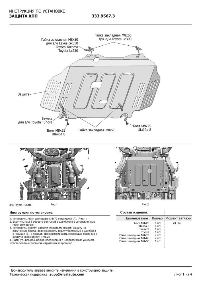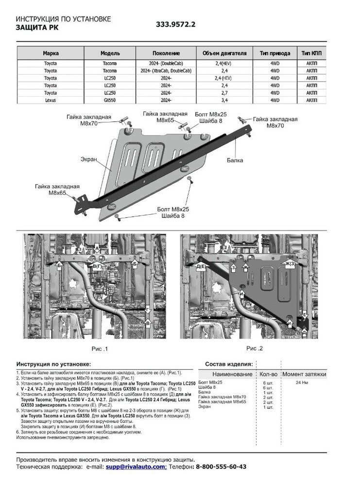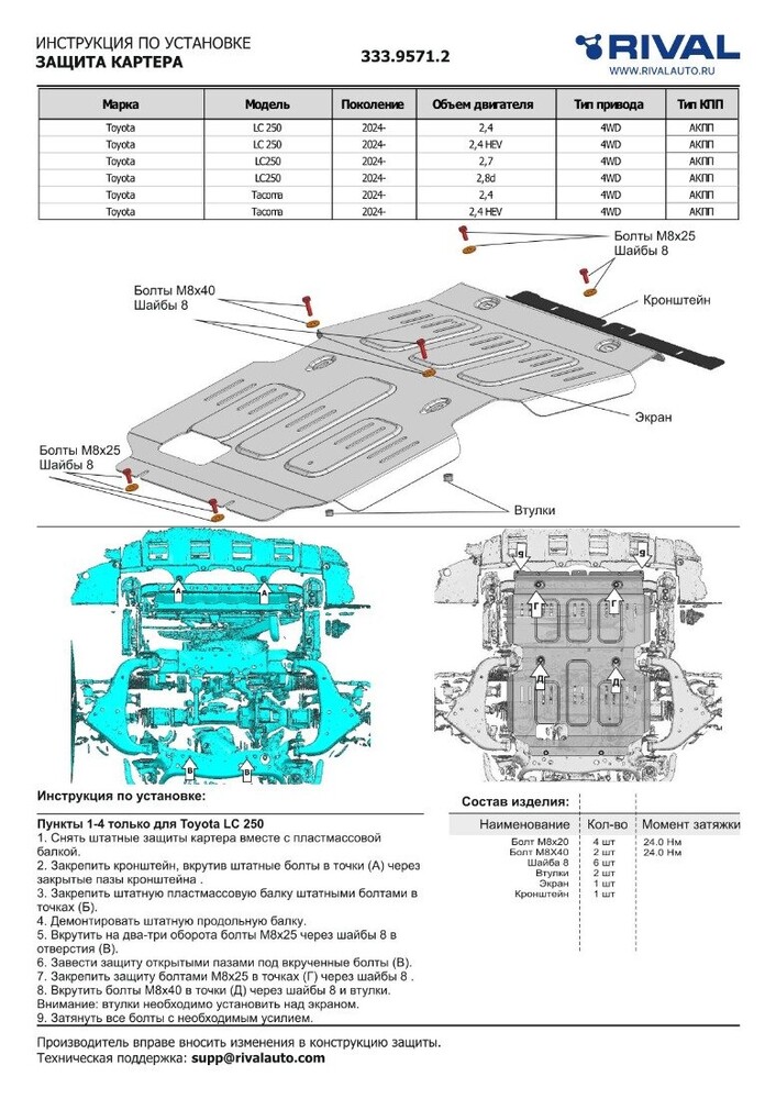 Защита картера, КПП, РК, топливного бака Rival для Toyota Land Cruiser Prado J250 V поколение АКПП 4WD 2024-н.в., алюминий 3 мм, с крепежом, штампованная