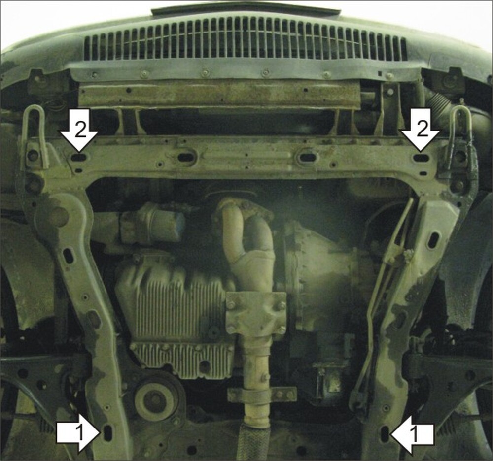 1. Установить в штатные отверстия подрамника а/м задние точки защиты при помощи ПР 80х20х6 М10 и Болтов М10х30.