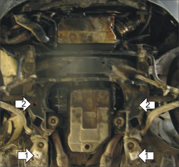 1. Установить на продольные балки передней подвески задние точки крепления Защиты при помощи ПР 50х20х6 М8, Болтов М8х20, Шайб 8 и Гроверов 8.