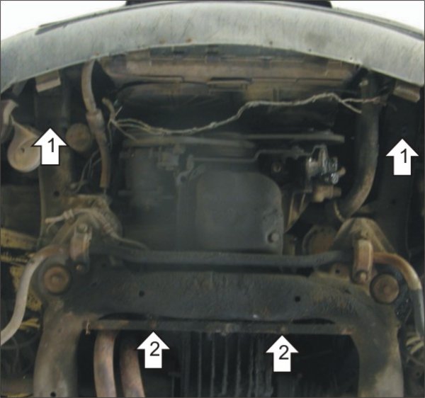 2. Установить на поперечную балку передней подвески задние точки крепления Защиты при помощи Болтов М8х30, Гаек М8, Шайб 8, и Гроверов 8.